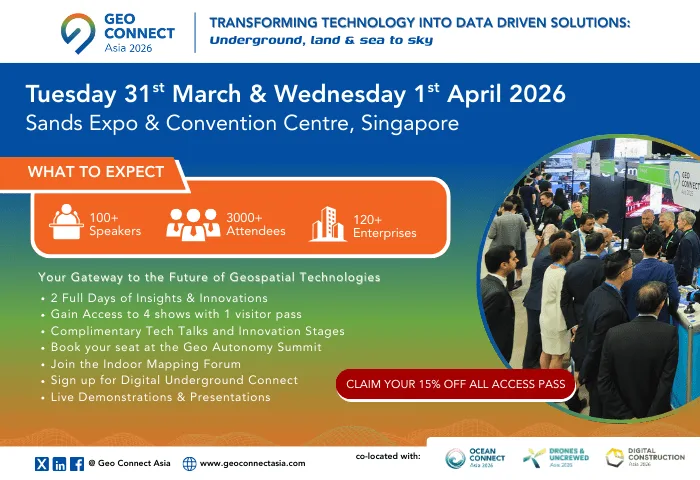 Geo Connect Asia 2026, themed “Geospatial driven impacts: underground, land & sea to sky”, focuses on bringing the geospatial and location intelligence industries together for two days of face-to-face discussions and networking on the 31st March & 1st April in Sands Expo & Convention Centre, Singapore.