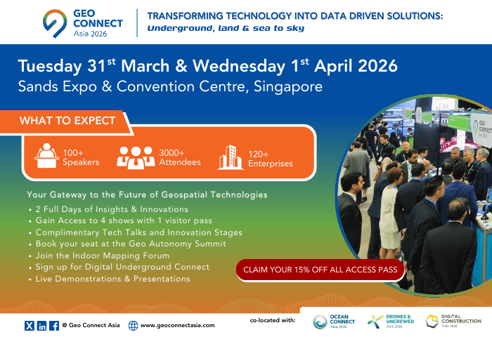 Geo Connect Asia 2026, themed “Geospatial driven impacts: underground, land & sea to sky”, focuses on bringing the geospatial and location intelligence industries together for two days of face-to-face discussions and networking on the 31st March & 1st April in Sands Expo & Convention Centre, Singapore.